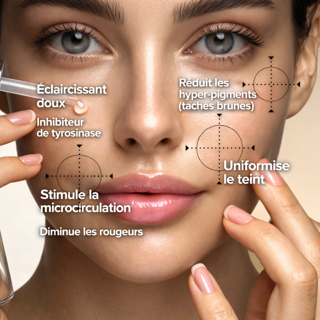Le sérum E3 est un éclaircissant doux. Il diminue la quantité et le degré de coloration des taches pigmentaires. Il permet aussi de diminuer la probabilité d'apparition des taches (vieillesse, exposition au soleil). Le sérum inhibe la tyrosinase, responsable de la production de mélanine. Il stimule la circulation sanguine pour diminuer les rougeurs.
