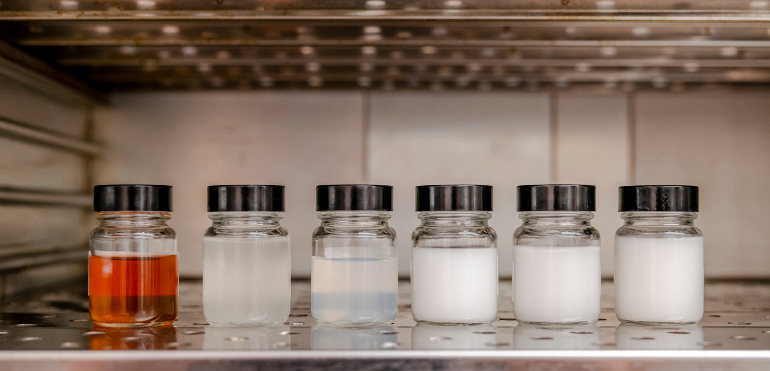Une fois les échantillons de produits finis obtenus, ils sont mis à l'épreuve du chaud, du froid et de la lumière pour observer la stabilité dans le temps.